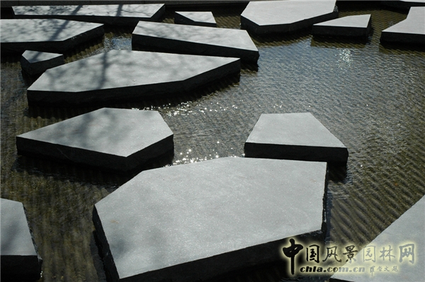 人造石將水面破解,這些石頭有不同的尺寸和形狀,并被隨機的放置,沒有過多的處理,讓它們更像是河流中真正的石頭。