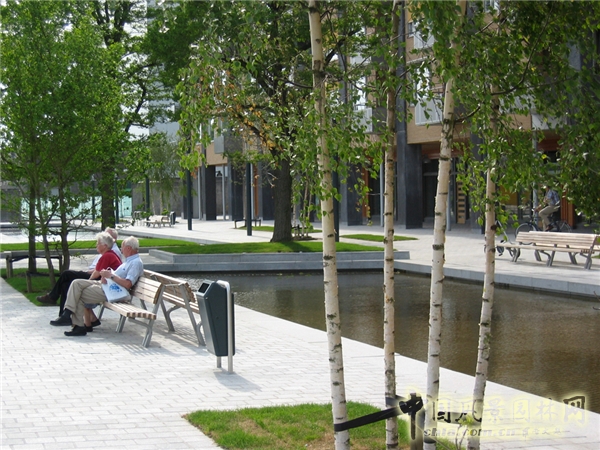 小溪的底部被設(shè)計成特殊的混凝土結(jié)構(gòu)--橫肋,這樣的形狀可以導(dǎo)致地面和水面持續(xù)運(yùn)動的景象,不僅成為城市的標(biāo)志和城市環(huán)境的一部分,而且還起到了減少水流量的作用。河道周圍布置了許多植物和基礎(chǔ)設(shè)施,如落葉喬木、長椅、垃圾桶、有趣的道路鋪裝等。有趣的樹皮和樹葉的顏色映襯在水面中,景象美妙至極。