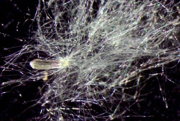 比雄花稍晚一些時(shí)期,雌株上的雌花開(kāi)始開(kāi)放,伴隨著雌花序的發(fā)育成熟,雌樹(shù)上鮮嫩的幼葉也開(kāi)始慢慢地長(zhǎng)出來(lái)。雌花序是由若干朵小花組成穗狀的葇荑花序,每一朵小花發(fā)育后長(zhǎng)成一個(gè)小蒴果,小蒴果里面包被著白色絮狀的絨毛,在絨毛中間藏著一些像芝麻粒大小的由胚囊發(fā)育而成的種子,隨著小蒴果及種子的不斷發(fā)育成熟,小蒴果逐漸裂開(kāi),那些白色絮狀的絨毛便攜帶著種子漫天隨風(fēng)飛散,試圖傳播繁衍下一代,擴(kuò)大她們的家族成員,這種現(xiàn)象就是前面我們所說(shuō)的“楊柳飛絮”。