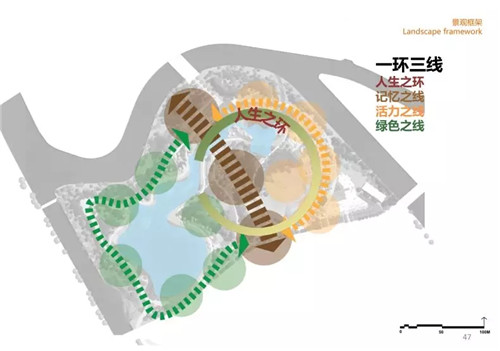 公園整體形成“一環三線”形態——活力之環,記憶之線、活力之線、綠色之線。
