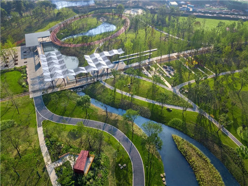成都沙河源公園,位于大西南建材城舊址,大量遺留的鐵軌及存儲木材的廠房被作為設計要素加以提煉。同時場地由府河、沙河環抱形成雙河環抱、四面環水的河心島形態,水質優良,植被茂密。這里也位于錦江綠道規劃帶中,成都沙河源公園的建立,形成了全新的、連續的城市綠廊。