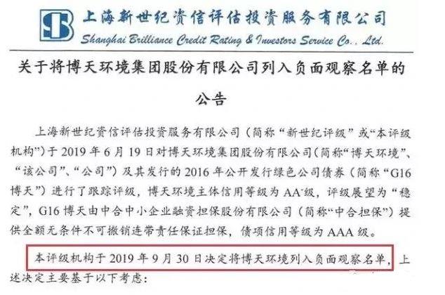 喬遷之喜并未持續太久,搬進新家后似乎也未得太多安定。10月8日,博天環境發布公告稱,公司收到信用評級機構新世紀評級發來的公告,新世紀評級將博天環境AA-級主體信用等級列入負面觀察名單。