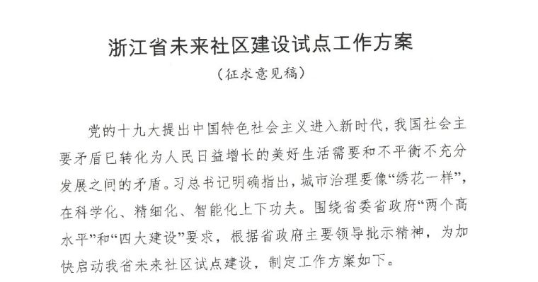 2019年3月 浙江省政府發布《浙江省未來社區建設試點工作方案》,首次提出未來社區的概念。