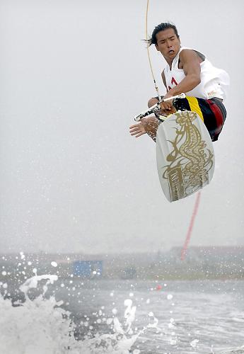 2007年8月30日,香港選手張豪龍在日照舉行的2007年中國水上運動會滑水男子尾波項目比賽中做空中騰躍動作。