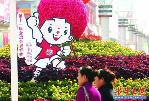 10月14日,第十一屆全運會吉祥物“泰山童子”出現在臺東三路步行街的花卉景觀上。據了解,全運會開幕在即,島城街頭出現了許多相關主題的雕塑、彩旗等,熱烈的全運氣氛日益濃厚。