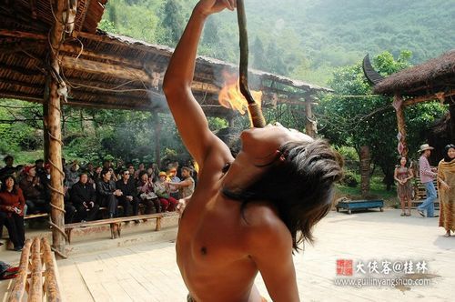 陽朔圖騰古道里面居住著皮里黝黑的甑皮人。他們或漁獵或采集,使用的依然是古樸的石器、骨器、原始的陶器、蚌器。在節(jié)奏明快的“妖鼓”下,穿著色彩斑斕的獸皮,手持鋒利的長(zhǎng)矛在山林里狩獵,燒蛇烤蚌為食,長(zhǎng)唱著人與自然和諧的漓江漁歌和桂山獵謠。