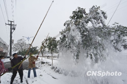 2009年11月12日下午,濟(jì)南市平陰縣園林工人清理街道兩側(cè)樹積雪,為樹木減負(fù),確保減少暴雪給園林樹木帶來的災(zāi)害。當(dāng)日,濟(jì)南遭受五年來最大一次降雪。中新社發(fā) 俄國慶 攝