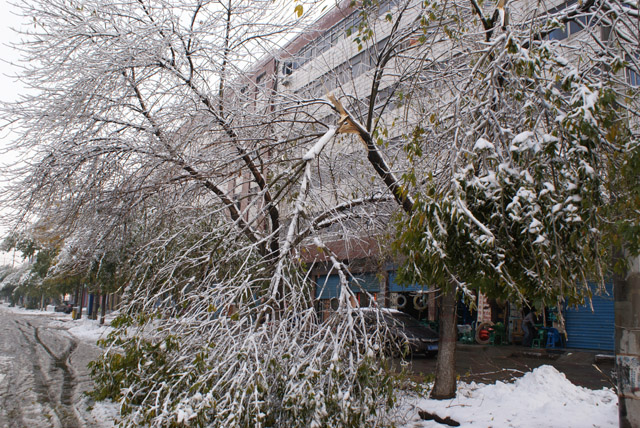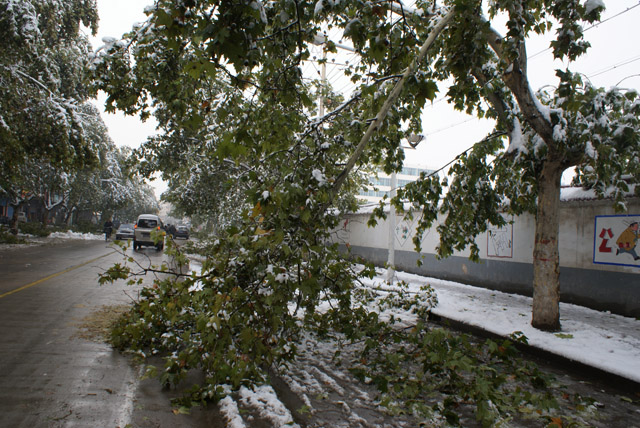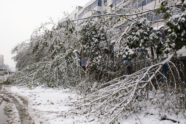11月11日,受強冷空氣影響,我市遭遇凍雨、大雪災害天氣,市區各游園、廣場及道路樹大量出現倒伏、斷枝等現象,導致部分交通受阻,通信、電力中斷,給群眾生產、生活帶來不利影響,經濟損失和生態損失巨大。據不完全統計,市區游園、廣場和道路約90%以上的喬木出現斷枝、倒伏、斷頭、劈裂等現象,直接經濟損失達2000多萬元。