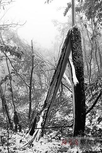 昨日是封山后的第3天,記者來到金頂山景區(qū)時,這里仍是一片冰凍世界,成片的林木被覆冰攔腰折斷。有的林木被連根拔起,倒伏在山間和路邊。冰災前還是郁郁蔥蔥的森林只剩下殘缺的樹桿,景象十分凄慘。