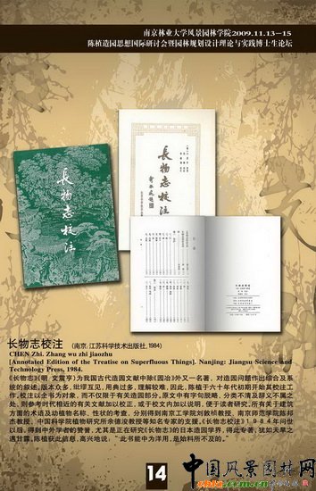 中國(guó)風(fēng)景園林網(wǎng) 2009年11月14日,陳植造園思想研討會(huì)暨江蘇省園林規(guī)劃設(shè)計(jì)理論與實(shí)踐博士生論壇在南京林業(yè)大學(xué)召開。此次會(huì)議的主題是"傳承·交融"。江蘇省建設(shè)廳、教育廳領(lǐng)導(dǎo)和來(lái)自國(guó)內(nèi)外的專家學(xué)者及風(fēng)景園林院校師生共計(jì)500余位參加了此次會(huì)議。