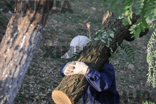 11月22日,園林工人在合肥市環城公園清理受損的樹。合肥市園林工人連日來清理在近期暴雪天氣中受損的花木。暴雪天氣造成合肥市區約25萬余株喬木和大型花灌木受損,樹木倒伏、歪斜、斷枝現象較為突出。新華社發(楊曉原攝)