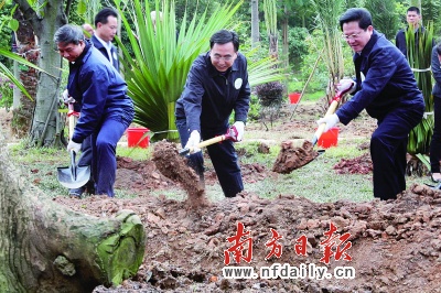 在植樹活動中,廣東省委常委、廣州市委書記、市人大常委會主任朱小丹,廣州市委副書記、市長張廣寧,廣州市政協主席朱振中等領導一起為“廣州亞運林”揭幕,并與各國駐廣州使館領事等共植秋楓、棉兩棵中心樹。