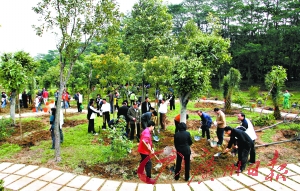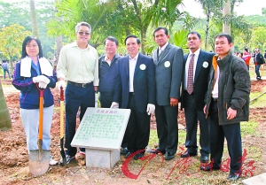 朱小丹、張廣寧、朱振中等在大夫山森林公園共植一株秋楓。 記者海國、顧展旭、陳安 實習生胡國球攝
