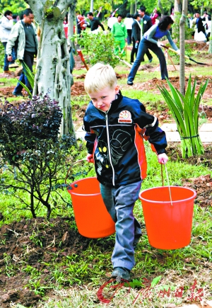 5歲外國小學生也積極參與了昨日的植樹活動。
