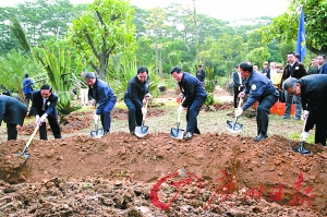 本報訊 (記者李婧、劉幸、全杰、王亮 通訊員柯琳)昨天上午,由廣州地區綠委、市林業和園林局、廣州日報報業集團、番禺區政府共同舉辦的共建“廣州亞運林”植樹活動,在番禺大夫山森林公園隆重舉行,進一步掀起了廣州全民齊動手、共迎“綠色亞運”的熱潮。省委常委、廣州市委書記、市人大常委會主任朱小丹,市長張廣寧,市政協主席朱振中與新加坡、越南、泰國駐穗總領事共同為“廣州亞運林”揭幕,并與主要來賓共植秋楓、棉兩大中心樹。