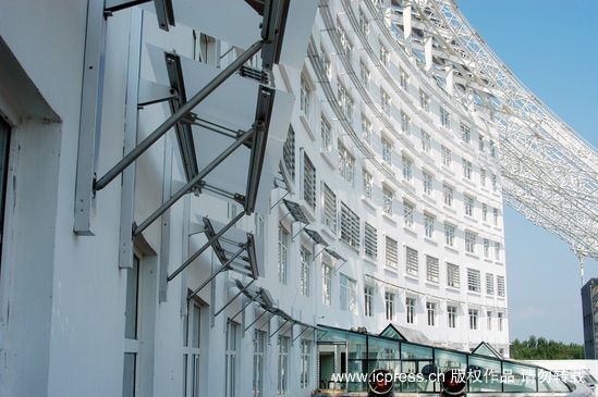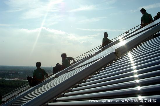 “日月壇-微排大廈”外層鋼結(jié)構(gòu)上架設(shè)了密密麻麻的集熱器。